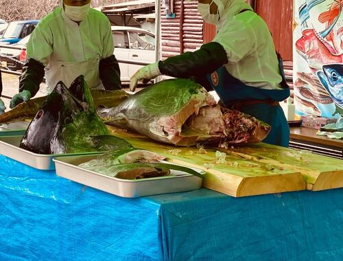 近所でマグロの解体ショーがあるというので行ってみました。 この日解体されていたのは49kgほどのマグロ。 (これが大きいのか普通なのか途中から見学したので聞き逃しました) かぶとの大きさはなかなかのもの。 見学していた小さな子供は「顔こわいー」…